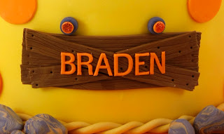 Anyway, on to the cake...a dear little boy, Braden, and his grandfather share a birthday. This year the theme is, I bet you can't guess, construction! He wanted a digger and that's about it. His mom helped out with a few more ideas. She wanted it to coordinate with the orange and yellow decorations. She also asked that I make a mini cake for Braden's grandfather with the two of them on top. Simple, but clean and cute...and perfect for a little boy who only really wants the digger!